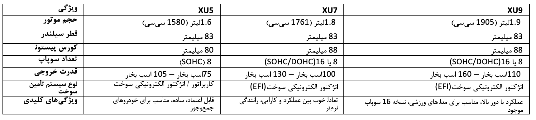 خانواده موتورهای XU به دلیل تنوع بالا و استفاده در انواع مختلفی از خودروهای پژو و سیتروئن شناخته میشود. این موتورها معمولاً در پیکربندی 4 سیلندر خطی و با مشخصات مختلف از جمله حجم موتور، قدرت خروجی، سیستمهای تأمین سوخت و سیستمهای زمانبندی طراحی شدند. در اینجا بررسی دقیقی از جنبههای فنی مهم برخی از مشهورترین مدلهای موتور XU، از جمله XU5 ،XU7 و XU9 آمده است.