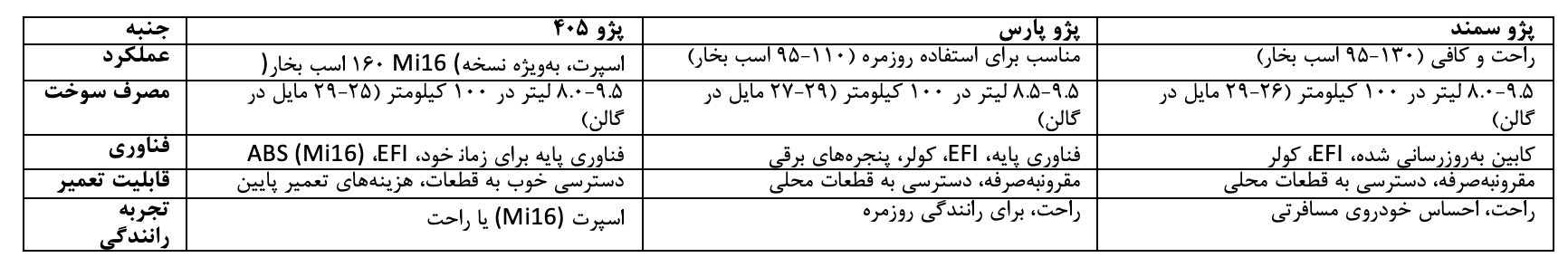 در نهایت، پژو ۴۰۵ به دلیل عملکرد و دینامیک رانندگی خود، بهویژه نسخه SLX، برجسته است. پژو پارس و پژو سمند گزینههای عملیتر و مقرونبهصرفهتر با عملکرد معقولتر و کارآیی سوخت بهتر هستند و هزینههای نگهداری و تعمیر کمتری دارند. با این حال، هر سه خودرو از نظر قابلیت تعمیر و دسترسی به قطعات در بازارهایی مانند ایران مشابه هستند.
