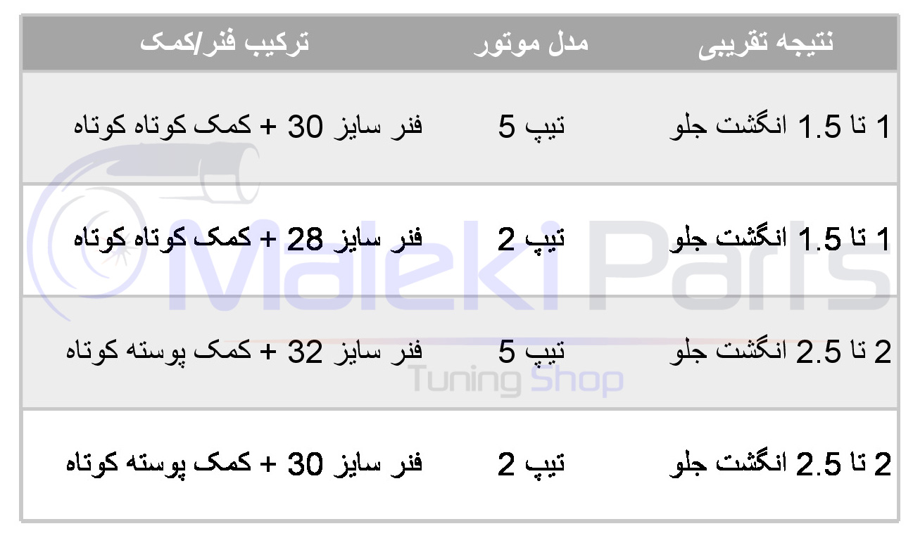 در میان مالکان این خودروها، کاهش ارتفاع با استفاده از فنر لول اسپرت و کمکفنرهای پوستهکوتاه بسیار رایج است. در ادامه، رایجترین ترکیبها و میزان تغییر ارتفاع برای موتورهای مختلف و سایز رینگهای فابریک بررسی میشود: